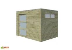Ce cabanon de jardin est doté d’une grande porte avec lucarnes, pour un accès facile, même pour les équipements relativement larges. Que vous souhaitiez y ranger des outils, du matériel de bricolage ou autres, son contenu n’aura pas à craindre la pluie, notamment grâce à sa toiture couverte de plaques ondulées bitumées. Ces dernières assurent en effet une bonne étanchéité au niveau du toit. Notez que cet abri est livré sans plancher, que vous retrouverez dans l’onglet « Accessoires ».
