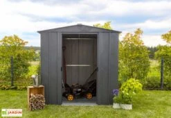 Solide, élégante et moderne, cette remise de jardin avec auvent est entièrement conçue en acier galvanisé, un matériau très résistant qui ne craint ni la corrosion, ni les rayons UV, et ce sans exiger de traitement ou d’entretien particulier. Elle est de plus disponible dans quatre finitions au choix, vous permettant ainsi d’opter pour la version qui s’intègrera le mieux dans votre jardin. Livré en kit, l’abri est composé d’éléments préfabriqués qui devront être assemblés par vos soins. Il devra être monté sur un sol dur et à niveau à l’aide de la notice détaillée incluse.