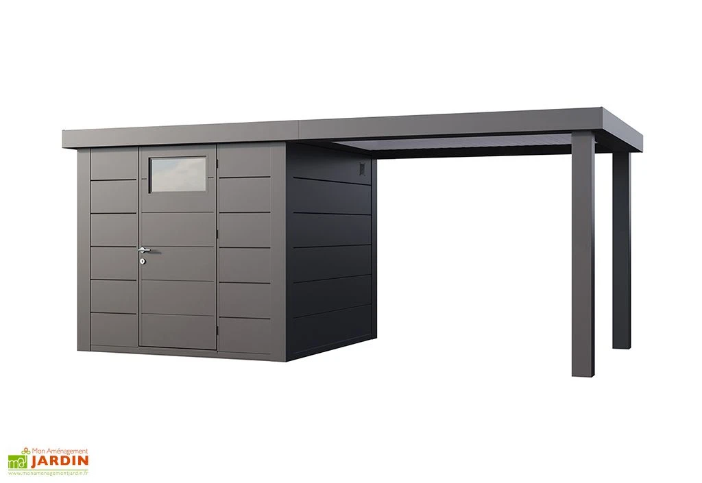 Cette cabane de jardin est dotée de parois de 0,9 mm d’épaisseur qui soutiennent une toiture plate (inclinaison du toit : 2°) composée de panneaux sandwich isolés de 4 cm d’épaisseur. Le toit intègre une gouttière avec descente, pour une évacuation efficace de l’eau de pluie pendant une averse, et pourra supporter une charge de neige de 220 kg/m². L’auvent pourra par ailleurs être monté sur le côté gauche ou à droite de l’abri.