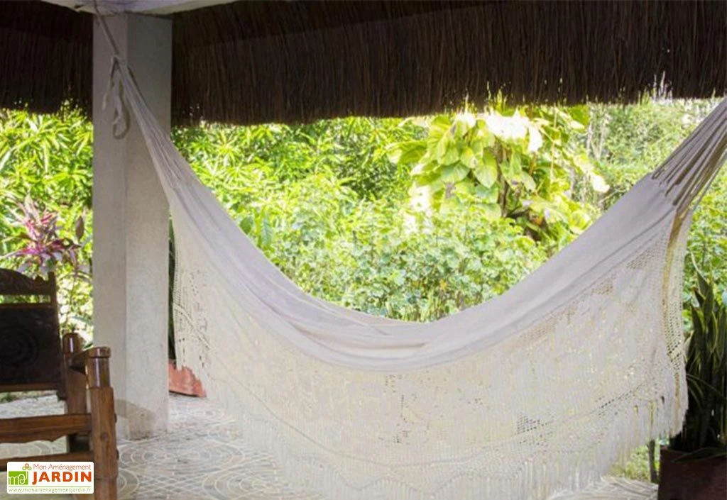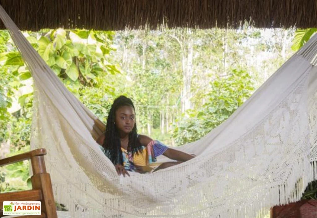 Le hamac double Bogota XXL de la marque Hamac del Sol est fabriqué à la main en Colombie. Il a été pensé pour offrir deux places confortables et pourra même accueillir un enfant en plus, dans de bonnes conditions ! Sa toile mesure 1,80 m de large sur 2,40 m de long (longueur totale : 4,10 m) et pourra supporter jusqu’à 250 kg.
