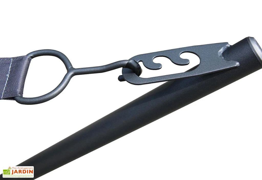 Le lit de jardin, accompagné de sa structure en acier, est autoportant. Il est relié aux pieds en acier par les deux extrémités à l’aide d’un crochet, et dispose également de 4 cordes qui vous garantissent sécurité et stabilité. A cela s’ajoutent la robustesse et la durabilité de l’acier, qui font de ce hamac de jardin une combinaison parfaite.