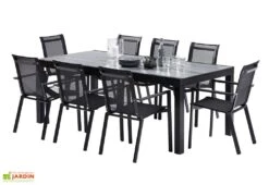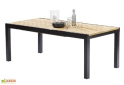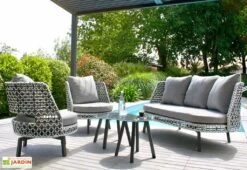 Le salon de jardin d’angle de la gamme Menfis comprend un canapé 2 places avec une tablette à droite, un canapé 2 places avec une tablette à gauche, un coin central et une table basse. Doté d’une structure en aluminium, il est très résistant aux intempéries ainsi qu’à la corrosion. Ce mobilier de jardin inclut des coussins sur les assises et les dossiers pour un maximum de confort. Les coussins disposent d’une densité de 190 g/m².