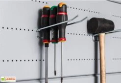 L’installation du porte vélo se fait facilement à l’aide de vis et chevilles fournies avec l’accessoire pour cabanon. Le porte vélo dispose d’un crochet recouvert de caoutchouc qui permet de répartir le poids sur la plaque de montage et va donc protéger la roue du vélo. La surface traitée du porte vélo offre une traction supplémentaire.