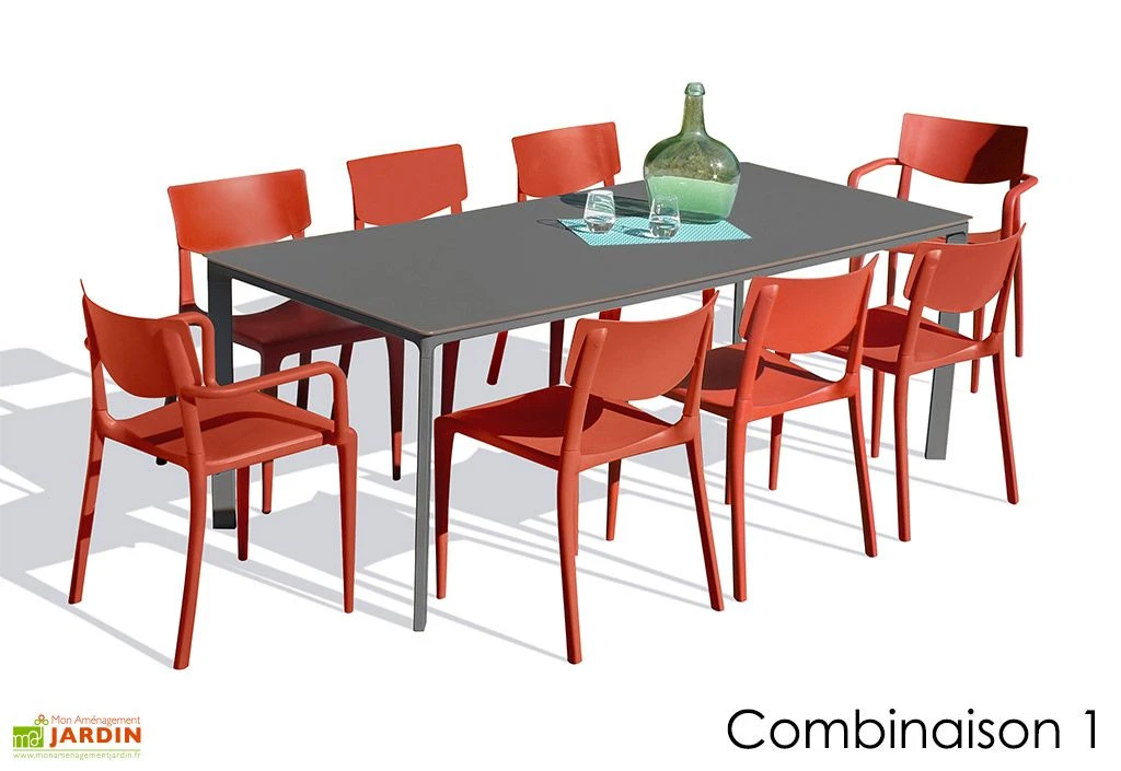 - Combinaison 1 : Table anthracite, 6 chaises et 2 fauteuils rouge brique