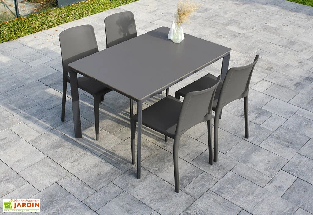 Le salon de jardin Ezpeleta est fabriqué au Portugal à partir d’aluminium, de stratifié haute densité et de polypropylène : des matériaux spécialement prévus pour la vie à l’extérieur. Le salon de jardin comprend une table 4 personnes et 4 chaises.