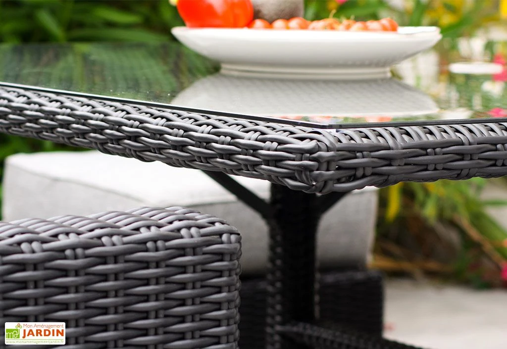 Les différents éléments qui composent ce mobilier de jardin sont dotés d’une structure en aluminium, un matériau robuste et naturellement insensible à la rouille. L’élégant revêtement en résine tressée demi-ronde qui habille l’ensemble se montrera pour sa part très résistant, notamment face aux intempéries et aux rayons UV, évitant ainsi tout risque de décoloration.