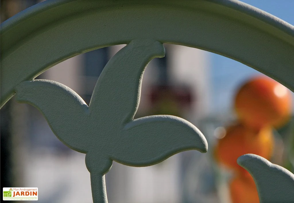 Le design du salon de jardin est travaillé de façon artisanale. Les pièces sont usinées, fondues et polies individuellement pour un travail impeccable. La table de jardin mesure 184 cm de longueur, 86 cm de largeur et 75 cm de hauteur. Les 6 chaises de jardin mesurent 54 x 50 x 96 cm (l,l,h). Un fauteuil et des chaises de jardin supplémentaires sont disponibles dans la rubrique « Accessoires ».