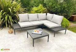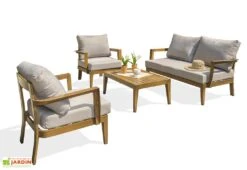 Entièrement fabriqué en aluminium, ce salon de jardin haut est parfaitement adapté à la vie en extérieur. L’aluminium est en effet naturellement résistant à la rouille, aux intempéries et ne demande aucun entretien particulier. Notez enfin que les accoudoirs du canapé, des fauteuils de jardin ainsi que les rebords du banc sont conçus en composite, un matériau lui aussi résistant aux agressions extérieures.
