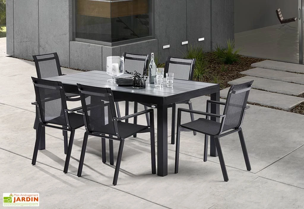 La table à manger a une dimension de 170 cm de long par 100 cm de large et 76 cm de haut, et peut atteindre une longueur de 260 cm grâce à sa rallonge. Les sièges mesurent 61 x 57 x 87 cm (l,l,h). Le salon de jardin est garanti 2 ans.