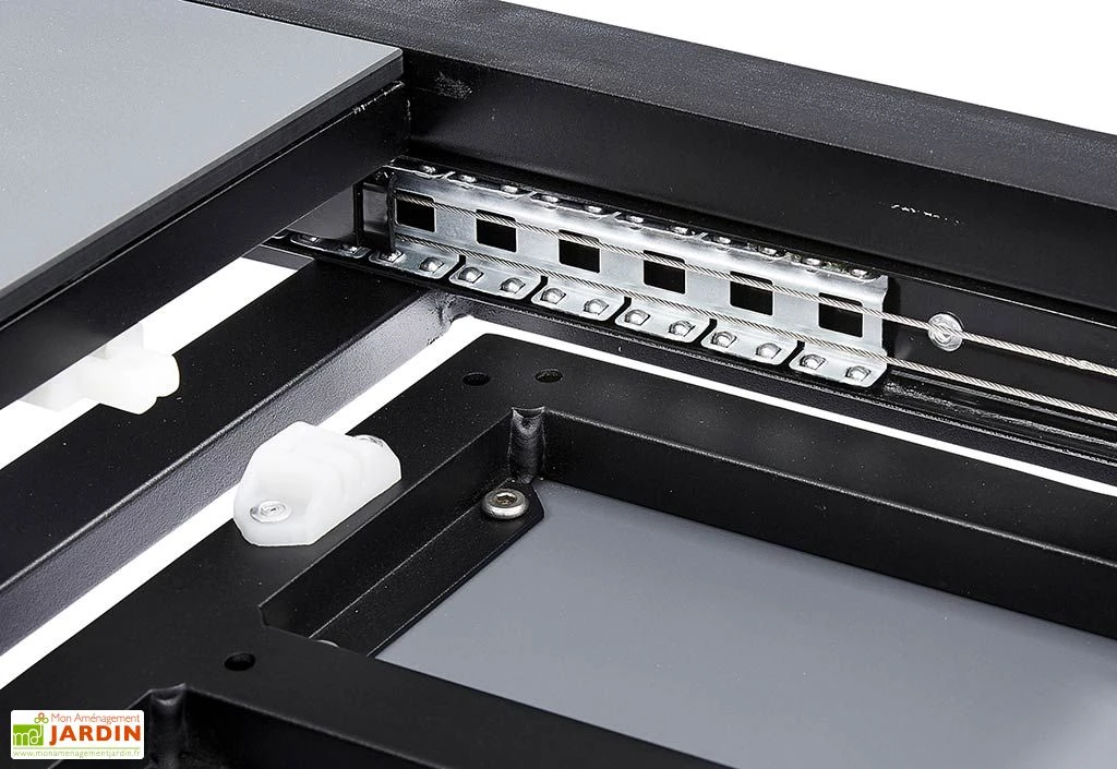 La table à manger se compose d’aluminium avec un plateau HPL (résine) de couleur gris. Elle est munie d’une rallonge permettant de passer d’une longueur de 210 cm à une longueur de 330 cm en quelques secondes. Fermée la table mesure : 210 x 100 x 76 cm (l,l,h).
