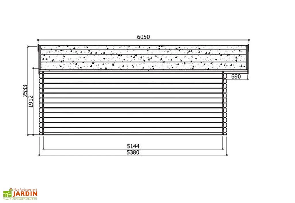 Votre abri de jardin Vernier de chez Solid est en sapin blanc du nord. Il dispose de parois de 28 mm d’épaisseur et d’un toit en 16 mm recouvert d’une toile bitumée. La pente de toit fait 14°. Les dimensions du chalet sont : 538 x 538 x 253 cm (l,l,h) pour une surface au sol de 28,94 m². La surface extérieure hors tout est de 34,84 m² et la surface intérieure est de 26,46 m².