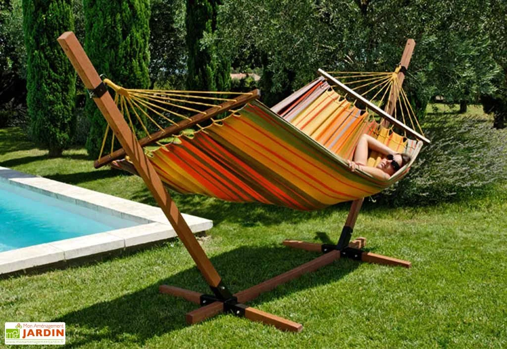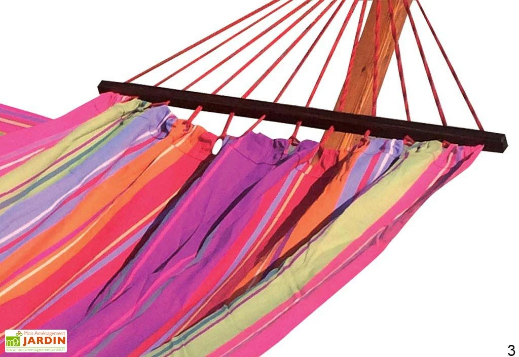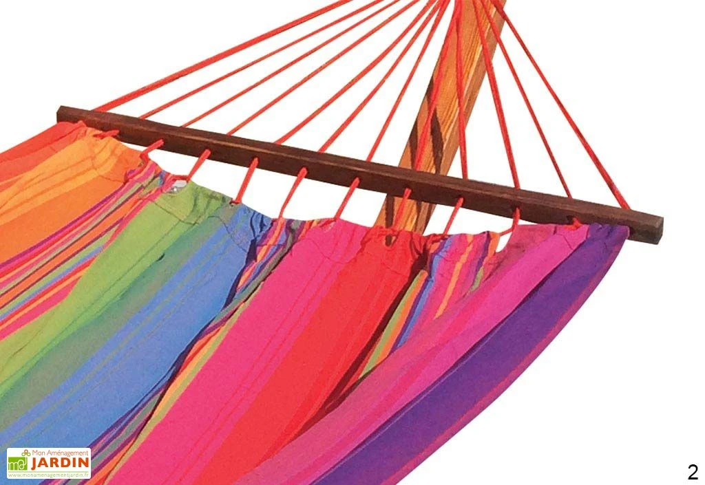 Cette toile de hamac est vendue seule, sans structure. Elle est intégralement fabriquée en coton et pourra supporter jusqu’à 130 kg. Elle est équipée de barres d’écartement en bois, pour un meilleur confort d’utilisation.